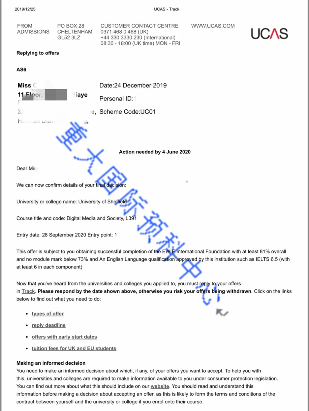 热烈祝贺2019届国际预科学生杜YH同学、蒋YJ同学、曹QY同学喜获谢菲尔德大学本科录取offer!录取专业是:会计金融和数字传媒